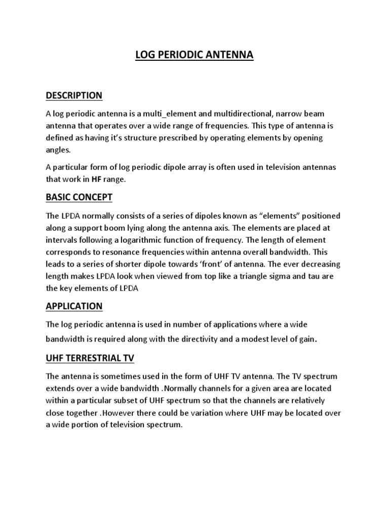 Concepts and Theory of the Log Periodic Antenna The lengths and spacing of the elements of a log-periodic antenna increase logarithmically from one end to the other. However they have a finite. Therefore Logarithmic Periodic dipole Antenna LPDA was constructed for monitoring Sun in the range of 45 870 MHz to precisely match the environmental requirements.